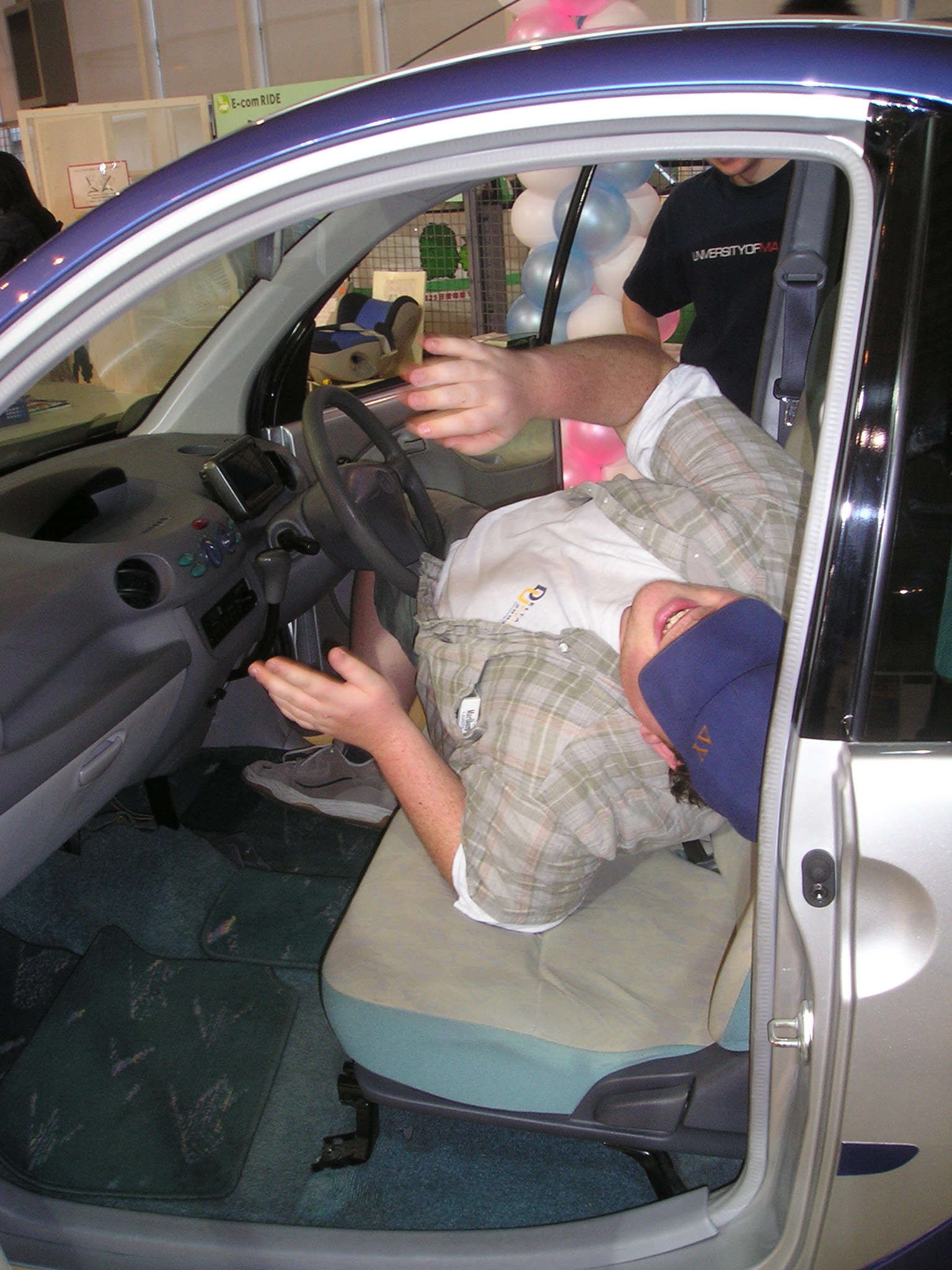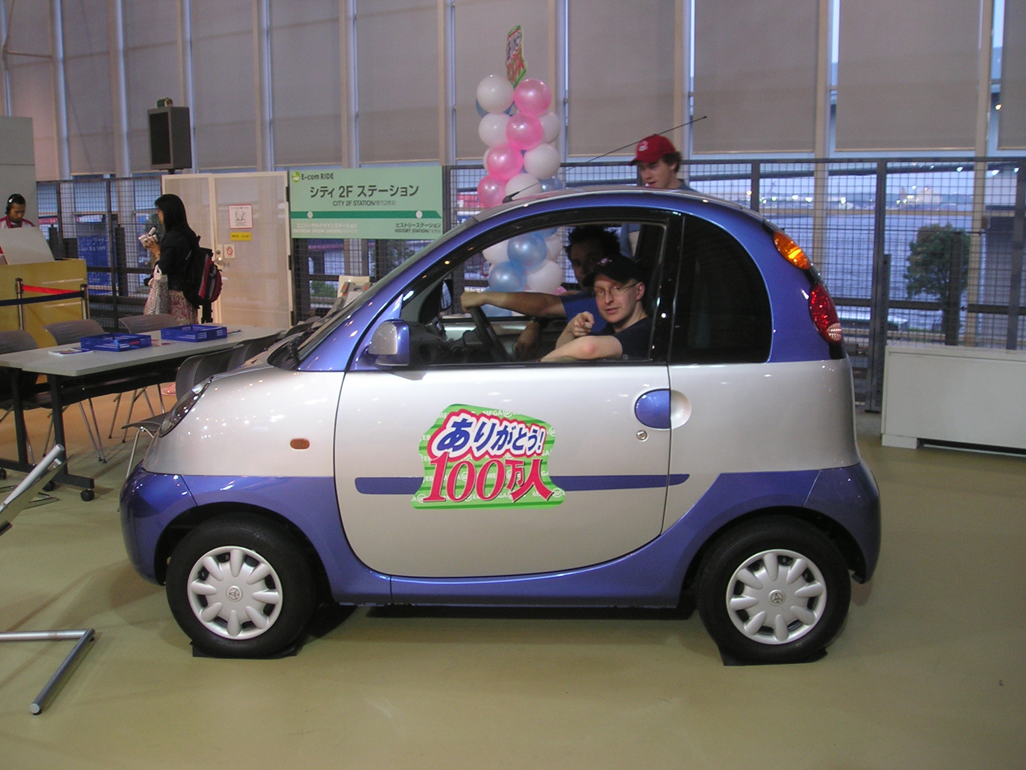 After dinner at Saizeriya, we decided to continue our Odaiba adventures with a visit to the Pallet Town shopping area. Pallet Town is an upscale shopping area with a cool European theme. The shopping area was okay, but for us the big attraction was MegaWeb, a giant Toyota showroom and “automobile theme park”. We got to look at and sit in all of the current and upcoming Toyota models including a tiny smart car model. The smart car was a comfortable fit for Code Red and I, but Flounder literally could not fit in the car at all. We got dirty looks from one of the employees while we laughed at Flounder.