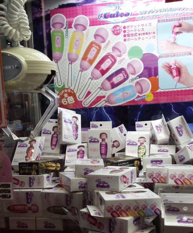 After lunch I made a visit to the Game Center and played whatever the newest version of Guitar Freaks is called before shooting some zombies and checking out the claw games. Most of the machines have cute anime characters as prizes, but one of them had something a bit different for “ladies day”.